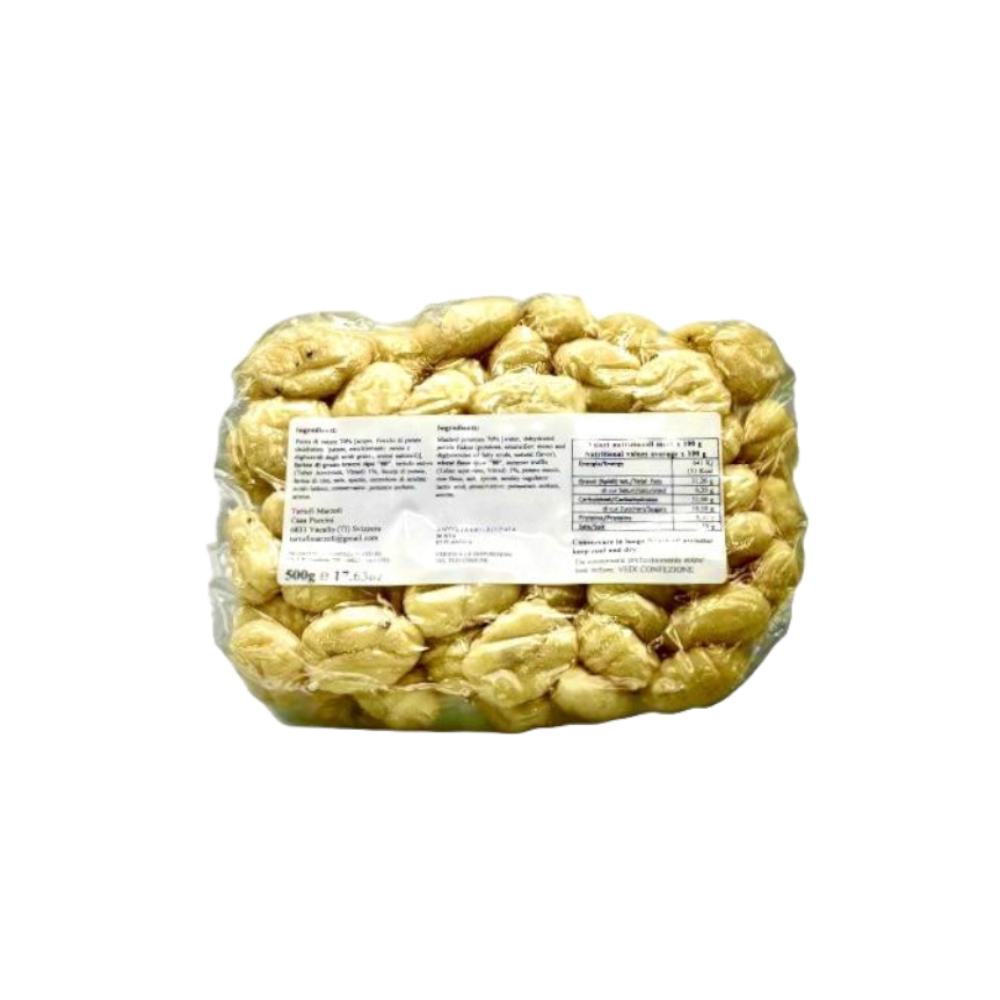 Ingredients: Potato puree 70% (water, dehydrated potato flakes, emulsifiers: mono and diglycerides of fatty acids, natural flavours), soft wheat flour type "00", summer truffle (Tuber aestivum Vittad) 2%, potato starch, rice flour, salt, spices, acidity regulator: lactic acid, preservative: potassium sorbate.