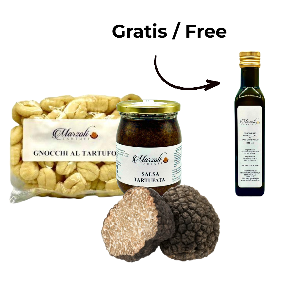 Thanks to the selection of Tartufi Marzoli's excellent products, you'll bring a dish with a bold and enveloping flavor to the table. Truffle Gnocchi, among the chef's favorites for their texture and flavor, pair perfectly with the intense aroma of White Truffle Oil,strictly free from preservatives and colorings. For an even more delicious touch, add a spoonful of Truffle Sauce, ideal for enhancing every bite with its intensity. Finally, complete your dish with a generous sprinkling of fresh black truffle petals, and prepare to be amazed.