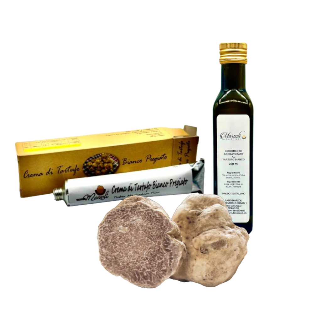 The pure White Truffle Cream , made with a very high percentage of truffle, is velvety and intense, ideal for elegantly enhancing first courses, eggs, or appetizers. The fragrant and harmonious White Truffle Oil adds a refined aromatic touch, even with just a few drops. What makes this kit truly special is the fresh White Truffle , the undisputed king of the table, to be sliced on the spot to release all its fragrance.